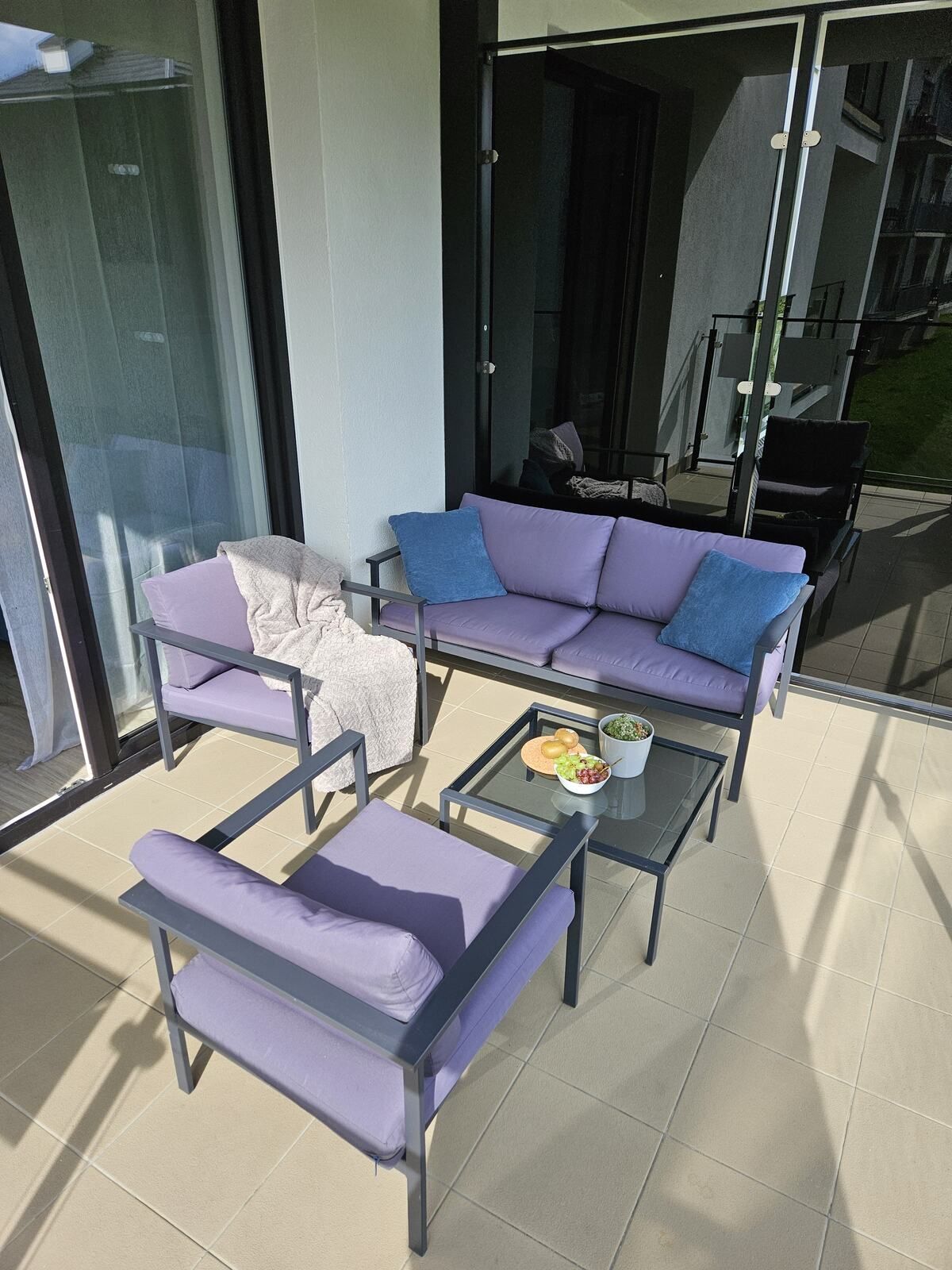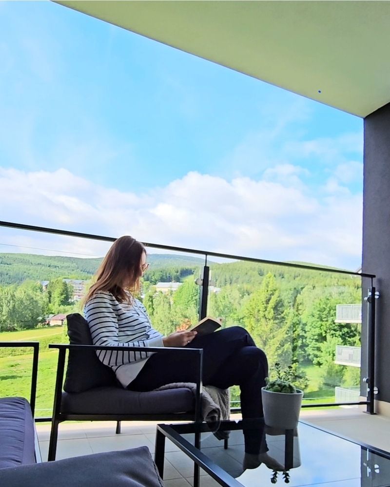 Na balkonie, z jednym z piękniejszych widoków w Świeradowie, czeka stolik kawowy i czyste górskie powietrze.
